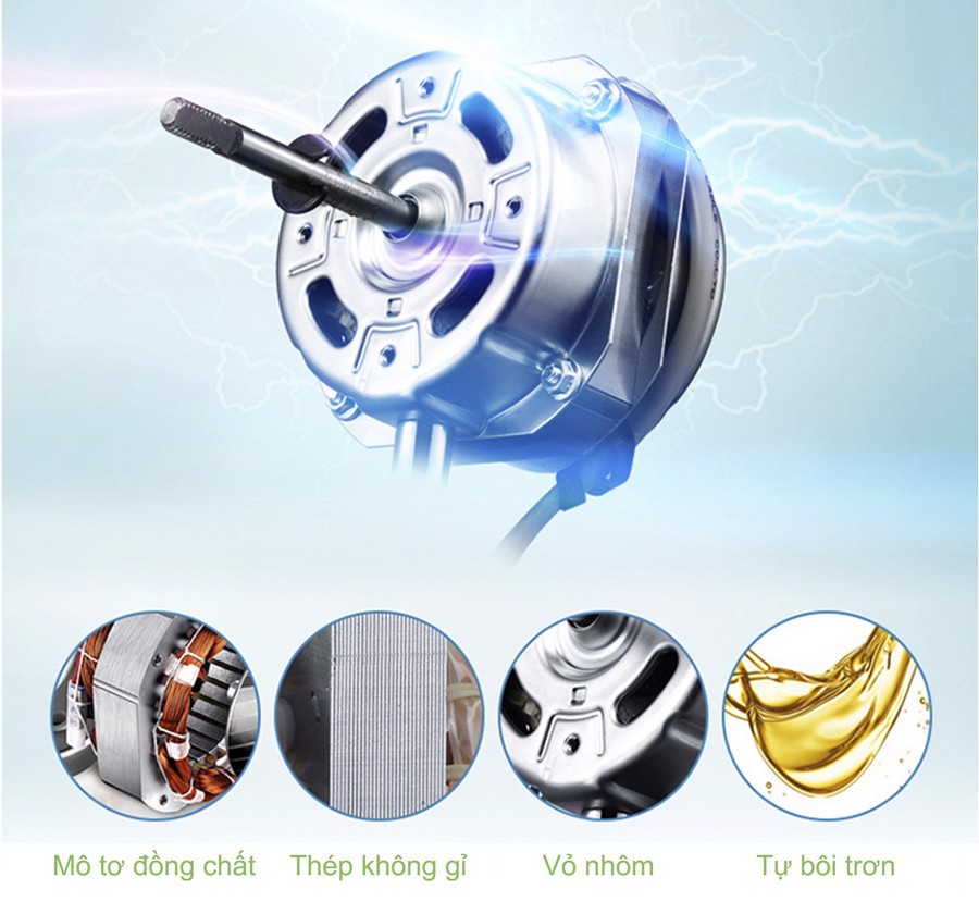 Bộ motor với lõi dây đồng 100% có độ bền nhiệt cao bên trong sẽ giúp cho quạt vận hành ổn định dài lâu kèm theo yếu tố tiết kiệm điện, giúp bạn yên tâm sử dụng mà không lo hao tốn điện năng trong nhà.